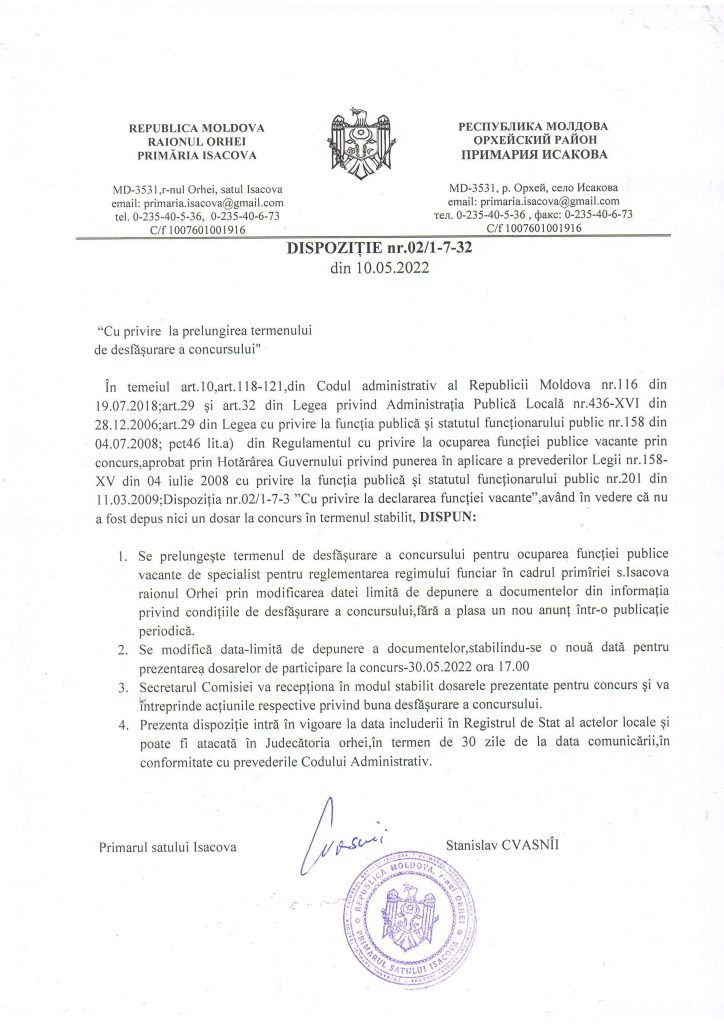 Anunț cu privire la prelungirea termenului de desfășurare a concursului pentru ocuparea funcției publice vacante de specialist în reglementarea regimului funciar